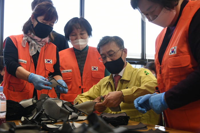 정하영 김포시장도 11일 오후 마스크 제작 열기로 가득한 김포시평생학습관을 찾아 고마움을 표시했다.