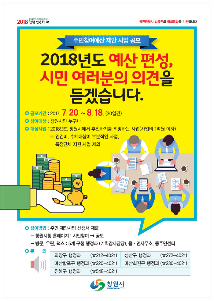 [로컬세계 김성현 기자]경남 창원시는 오는 20일부터 8월 18일까지 30일간 ‘2018년도 예산편성’을 위해 5억원 규모의 주민참여예산 제안사업을 공모한다고 19일 밝혔다.