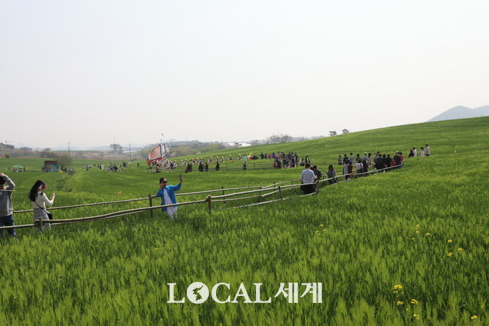 '제16회 고창 청보리밭 축제'가 20일 오전 전북 고창군 학원관광농장에 개막했다. 드넓은 부지에 펼쳐진 청보리가 바람에 이리저리 몸을 흔드는 모습은 손에 꼽히는 봄철 장관이다.(사진=김경락 기자)