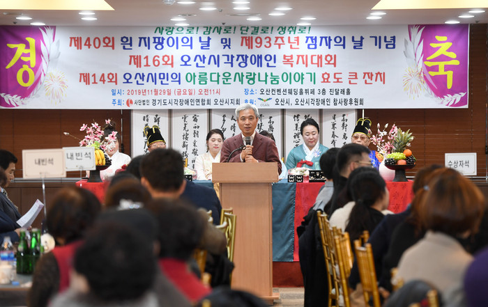 | ▲곽상욱 시장이 지난 29일 오산컨벤션웨딩홀에서 열린 제40회 흰 지팡이의 날 및 제93주년 점자의 날을 기념하는 제16회 오산 시각장애인 복지대회에서 인사말을 하고 있다.(오산시 제공) |