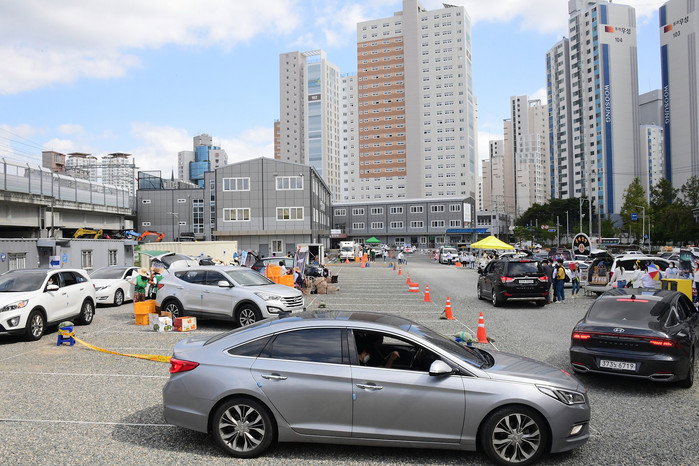 | ▲동래구 임시주차장에서 다 주라 드라이브스루 명절 장터개최한 모습. |