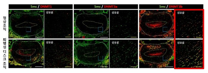 그 결과 퇴행성 허리디스크 모델의 수핵 및 섬유륜 영역에서 DNMT3b가 가장 강하게 발현된 것으로 밝혀졌다. 이에 대해 연구팀은 5mC를 발현하는 대부분의 세포가 DNMT3b를 발현한다고 볼 수 있으며 이는 퇴행이 진행된 디스크의 DNA 메틸화에 DNMT3b 효소가 가장 크게 관여함을 의미한다고 해석했다.