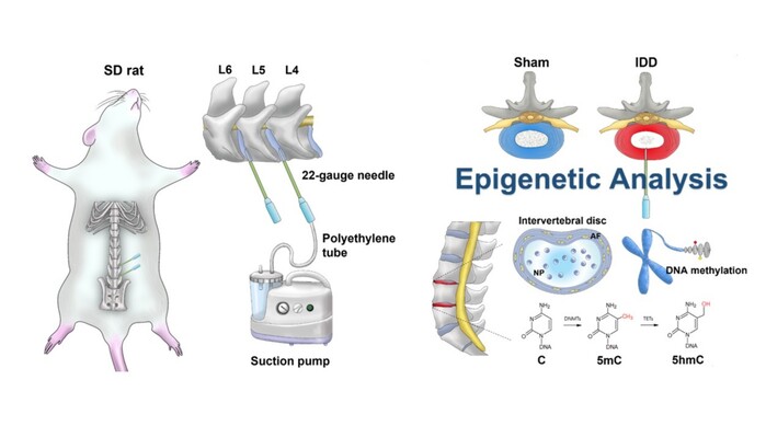 먼저 연구팀은 퇴행성 허리디스크 동물모델 제작을 위해 쥐의 복부를 절개한 뒤 디스크(추간판)에 구멍을 내 수핵을 제거했다. 이어 4주 후, 후성유전학적 변화와 통증 조절 기전의 관계를 파악하기 위해 디스크의 구성요소인 수핵과 그 주위를 둘러싼 두꺼운 막인 섬유륜의 변화를 관찰했다.