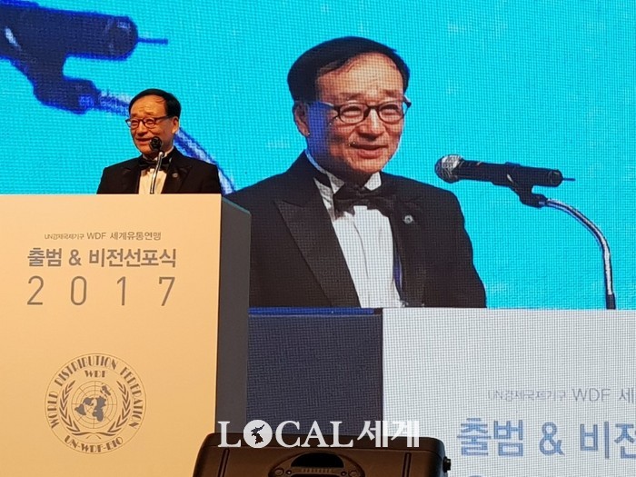 | ▲이재학 UN NGO WDF 세계유통연맹 의장이 19일 서울 그랜드 하얏트호텔 그랜드볼륨에서 열린 출범 & 비전선포식에서 인사말을 하고 있다.김재덕 기자. |