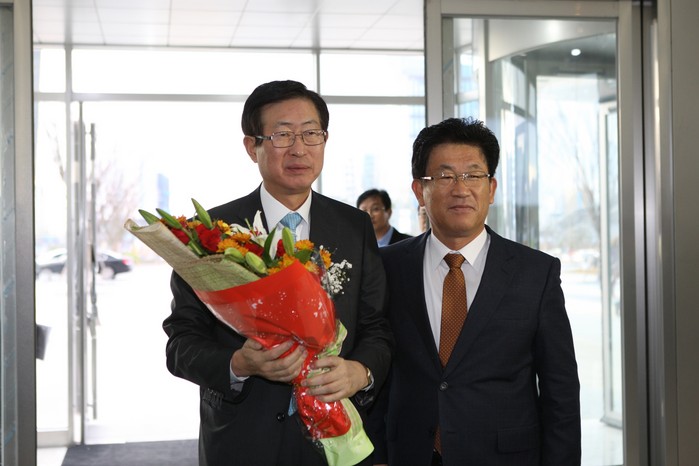 ▲조환익 한전 사장(왼쪽)이 강인규 나주시장이 건네준 꽃다발을 들고 포즈를 취하고 있다. ©로컬세계 |
