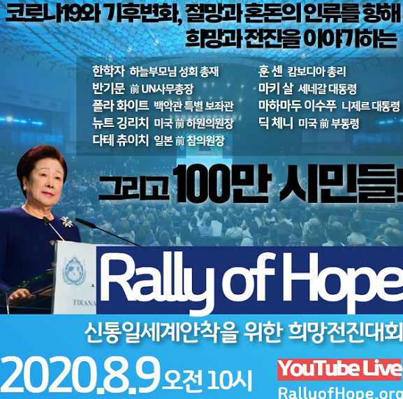 이번 희망전진대회는 코로나19 사태로 인해 새롭게 불거지거나, 급격히 악화되고 있는 세계적 문제들에 대한 대응방안과 해법 등을 한학자 가정연합 총재(사진)를 비롯해 반기문 전 유엔사무총장, 딕 체니 미국 전 부통령, 뉴트 킹그리치 전 미국하원의장, 다테 주이치 전 일본 참의원 의장이 참석한다.