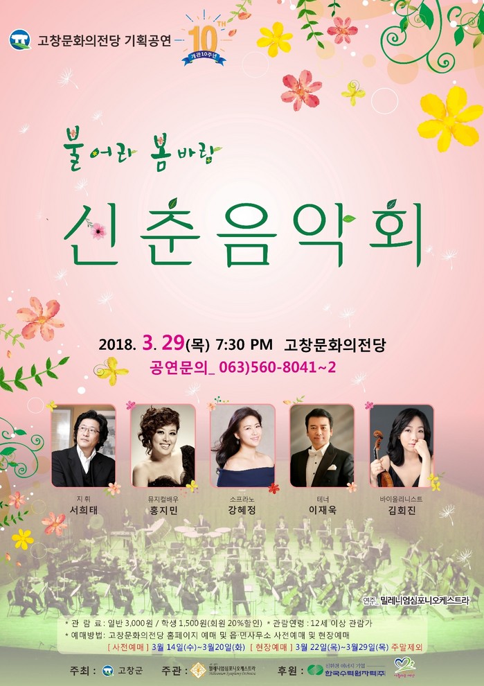 [로컬세계 김경락 기자]전북 고창군(군수 박우정)이 새봄을 맞아 오는 29일 오후 7시 30분부터 고창문화의전당에서 ‘불어라 봄바람! 2018 신춘음악회’ 를 개최한다고 26일 밝혔다.