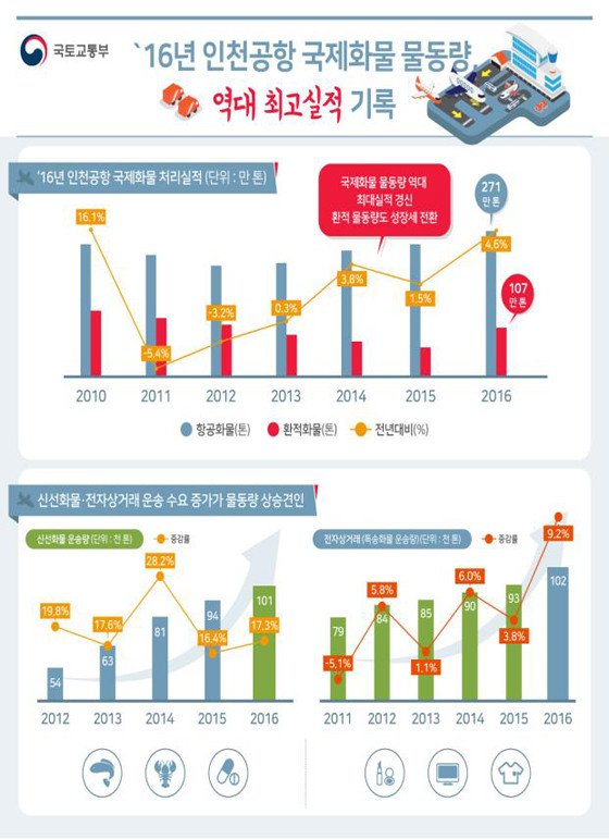 [로컬세계 박민 기자]국토교통부와 인천국제공항공사는 지난해 인천국제공항의 국제화물 물동량이 전년대비 4.6% 증가한 271만4000톤을 기록하며 개항 이후 최대치를 경신했다고 3일 밝혔다.