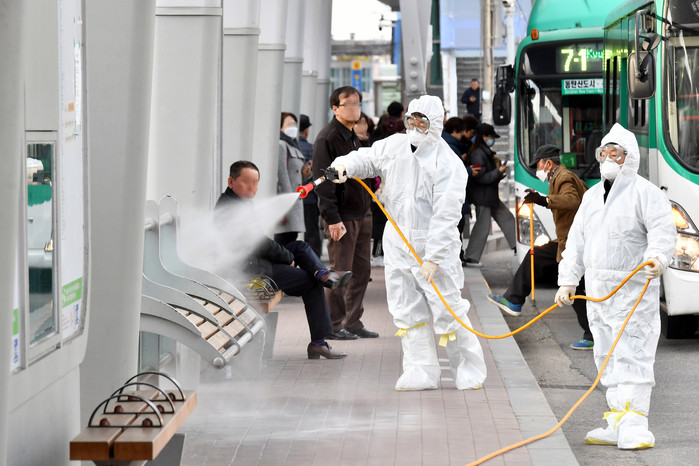 | ▲29일 팔달구보건소 직원들이 수원역 앞 버스정류소에서 방역작업을 하고 있다. |