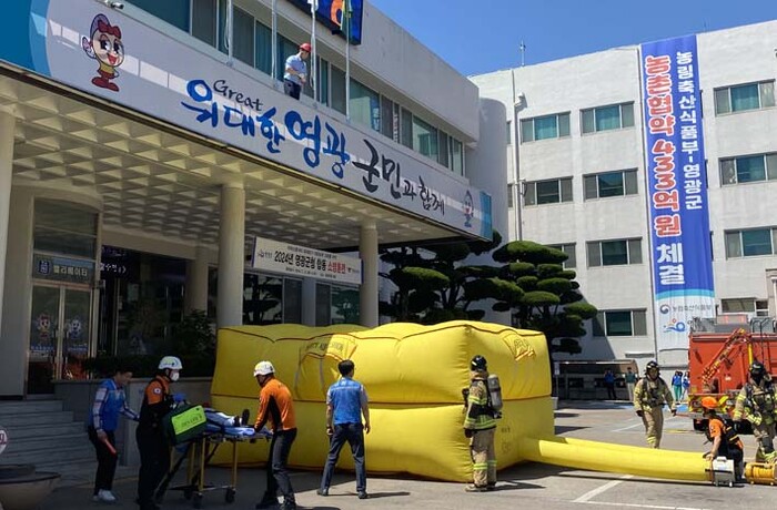 [로컬세계 = 이남규 기자]전남 영광군은 31일 군청사 일원에서 영광소방서와 합동소방훈련을 실시했다.