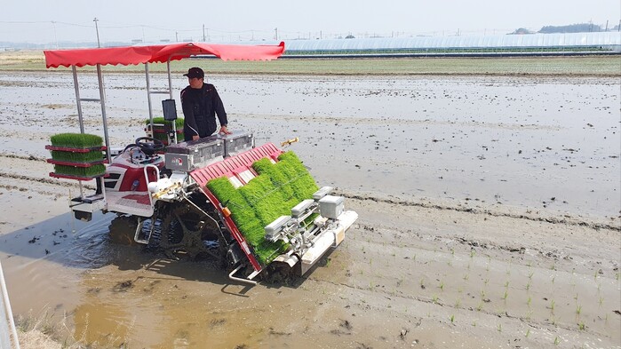 ▲ 동김제농협 이앙기에 농기계 자율주행 키트(플루바오토)를 부착해 1인 이앙작업을 시연하고 있다. 농협 제공 |