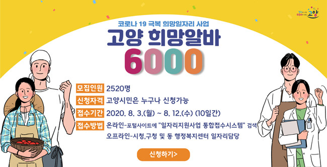 [로컬세계 강영한 기자]경기 고양시는 단기 공공일자리를 제공하는 ‘고양 희망알바 6000’ 참여자를 오는 8월 3일부터 12일까지 10일간 모집한다고 밝혔다.