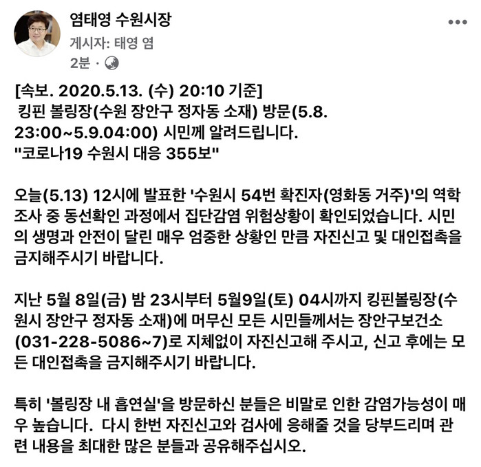 염 시장은 13일 오후 8시 10분 자신의 페이스북을 통해 "장안구 영화동에 거주하는 수원시 54번 확진자가 역학조사와 동선 파악 과정에서 집단감염이 우려되는 위중한 상황이 확인돼 알려드린다"며 “많은 시민의 안전이 달린 매우 엄중한 상황인 만큼, 자진신고 및 대인접촉을 금해 달라”고 강조했다.
