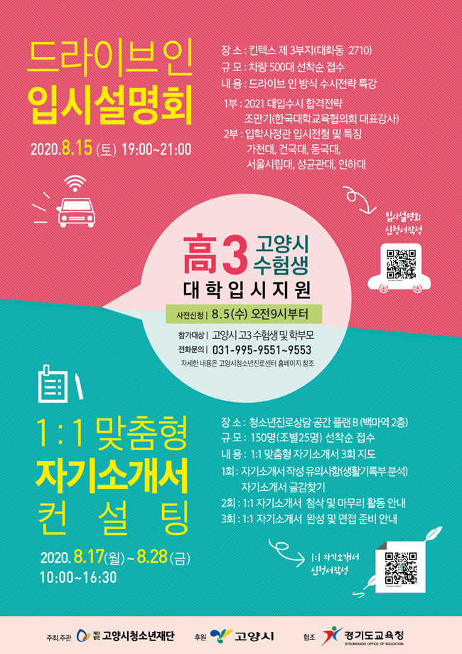 [로컬세계 강영한 기자]경기 고양시는 오는 8월 15일부터 28일까지 킨텍스 제3전시장 부지에서 고양시 청소년재단, 경기도 교육청과 함께 고3 수험생과 학부모를 대상으로 2021학년도 대학입시설명회 및 상담박람회를 ‘드라이브 인’ 방식으로 개최한다고 밝혔다.
