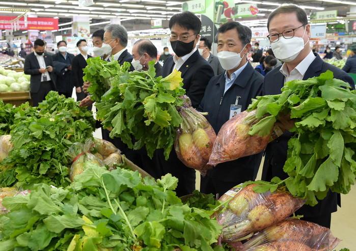 | ▲농협 하나로마트 양재점(서울 서초구 소재)에서 열린 김장재료 소비촉진 특별판매 행사에서 농협유통 정연태(사진 오른쪽 두 번째) 대표이사와 대상(주) 이강덕(” 세 번째) 본부장등이 김장재료인 다발무를 살펴보고 있다. |