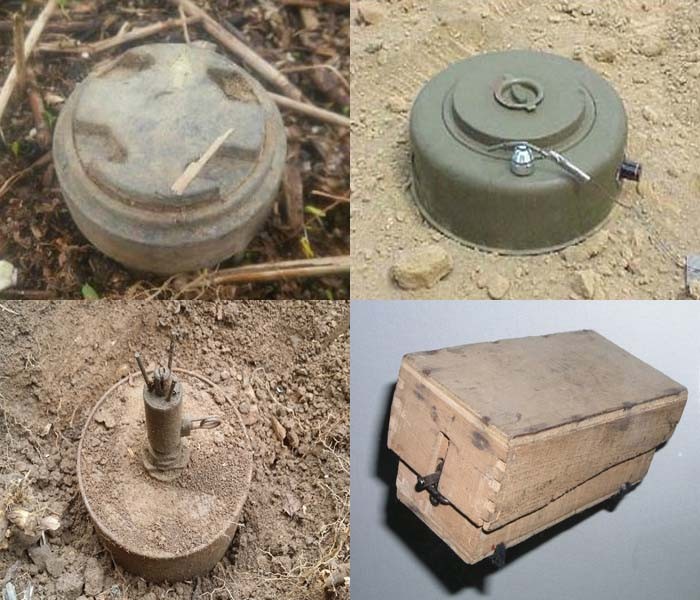 | ▲위 왼쪽부터 시계방향으로 M14 대인지뢰, M15 대전차지뢰, M16 대인지뢰, 北 목함지뢰. |