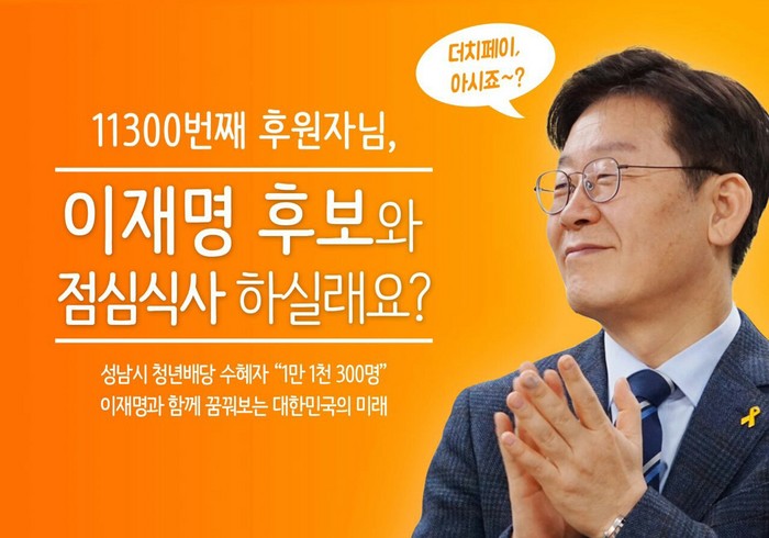 이재명 후보는 1만1300번째 후원자와 점심 식사를 할 예정이라고 밝혔다.