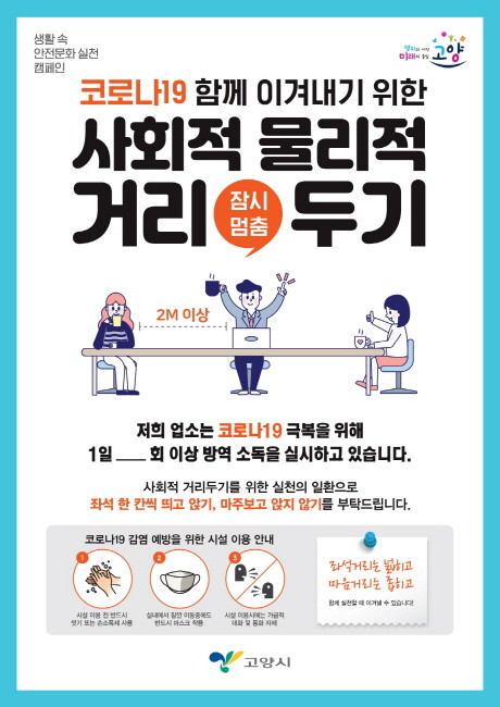시는 우선 시청 및 덕양구·일산동구·일산서구청 등 관공서 구내식당 자체적으로 물리적 거리 두기를 실천하고 있으며, 음식점과 미용실 등 식품·공중위생업소까지 범위를 확장시켜 ‘물리적 거리 두기’ 캠페인 실시, 참여를 요청하는 안내 포스터와 홍보물(삼각 POP사진)을 제작·비치하는 등 코로나19 확산 차단을 위한 시민들의 적극적인 동참을 독려했다.