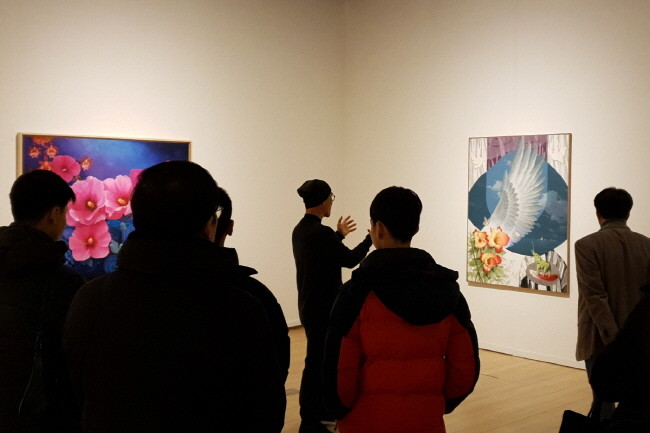 | ▲ 22일 오후 고양아람누리 아람미술관에서 정재왈 고양문화재단 대표이사, 지상엽 공공운수노조 고양문화재단지회장 등 임직원들과 사랑의 동산 가족들이 재단 기획 전시 ‘고양원로작가초대전-은빛나래’를 도슨트의 설명과 함께 감상하고 있다. |
